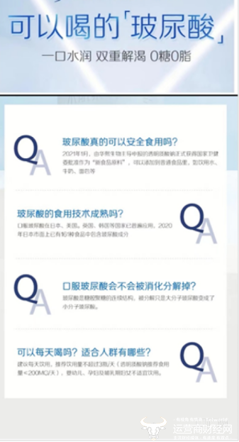 据其发布的消息显示,玻尿酸食品企业很少在自己的营销广告和营销页面中宣传产品可以“可以吃出水光肌”,但会做很多铺垫和暗示。比如,某生物公司旗下“水肌泉饮料旗舰店”在玻尿酸饮用水中的销售页面中特别突出“可以喝的玻尿酸”、“双重解渴”暗示饮用水中的玻尿酸可以给皮肤补水等。
