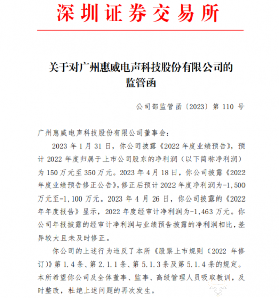 值得一提的是,前不久,惠威科技因公司年报披露的经审计净利润与业绩预告披露的净利润相比,差异较大且未及时修正,被深圳证券交易所下发了监管函。