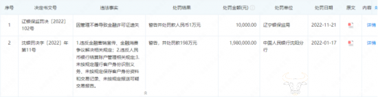 而在去年,华夏银行沈阳分行曾两次被罚,共计199万。具体来看,在1月17日,该行因“违反金融营销宣传、金融消费争议解决相关规定;违反人民币银行结算账户管理相关规定”等多项违法事实被中国人民银行沈阳分行警告,并处罚款198万元。11月21日,该行又因管理不善导致金融许可证遗失,被辽宁银保监局警告并处罚款人民币1万元。