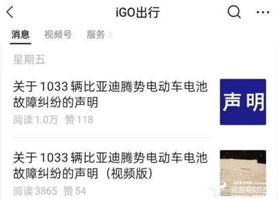 运营商财经网注意到,在今年2月,深圳市爱出行汽车租赁公司在社媒公开发声,表示公司购买的1033辆腾势电动车电池出现故障。