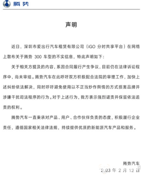 对此,腾势官方也做出了回应,称相关方提及的内容,系因合同履行产生争议,目前仍在法律诉讼程序中,尚未审结。