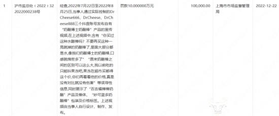在去年底,奶酪博士因为“编造、传播虚假信息或误导性信息,损害竞争对手的商业信誉、商品声誉”,被上海市市场监管局处以10万元的罚款。