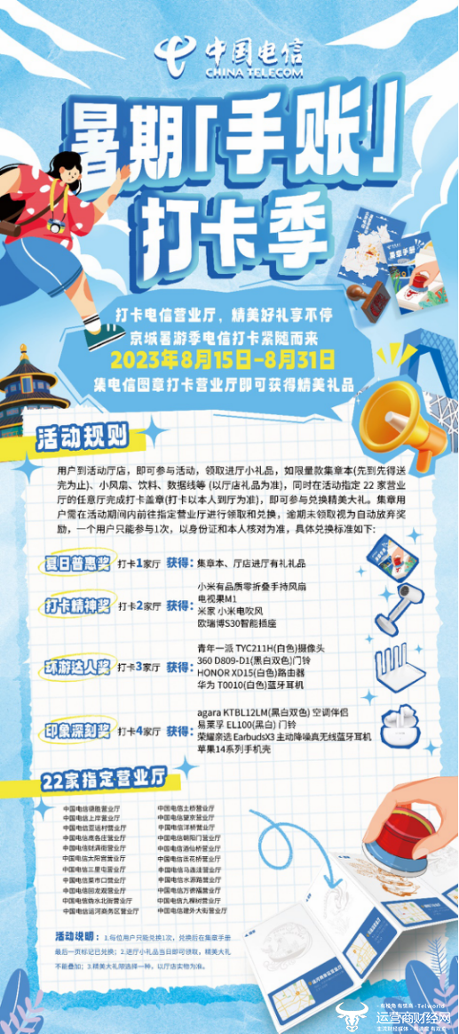 打卡方式:8月15日-31日,线下抵达北京电信任一集章活动指定营业厅,即可盖章~还有机会获得限量款集章手册和集章小礼品(先到先得,详询活动营业厅)。