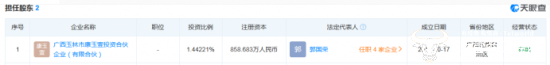 除此之外,他还是广西玉林市康玉壹投资合伙企业(有限合伙)的股东,持股占比约1.44%。