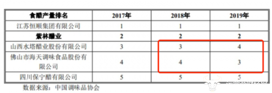 但根据2019年中国调味品协会公布的数据显示,中国食醋产量前三甲分别是恒顺醋业、紫林醋业、海天味业,水塔醋业被海天味业挤出了前三名。