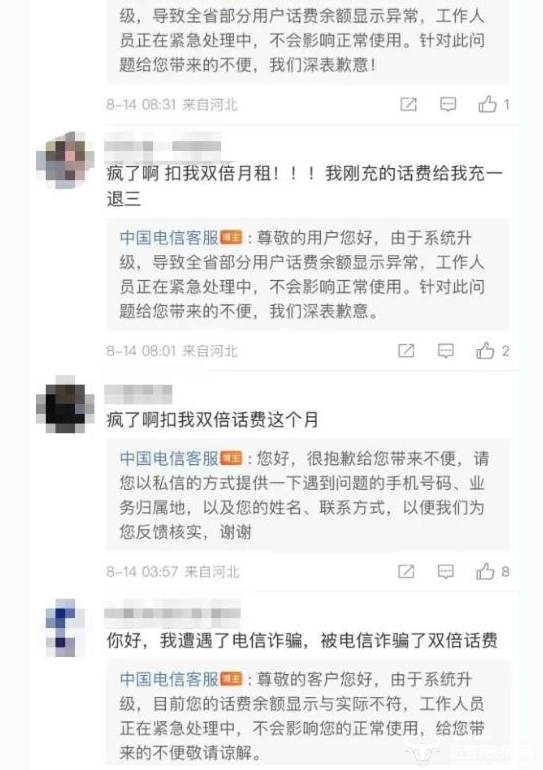 据了解,就在8月14日当天,中国电信客服及时回应称,“由于系统升级,导致全省(河北省)部分用户话费余额显示异常,工作人员正在紧急处理中,不会影响正常使用。”
