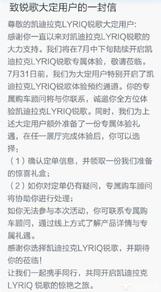 凯迪拉克公开发布的致锐歌大定用户一封信中表示:如果车主继续确认订购锐歌,可以获得AKG品牌耳机一副;车主也可以选择终止订购,申请取消订单并退还5000元定金。