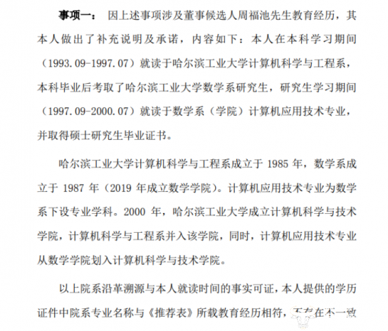 周福池本人则在公告中做出了补充说明及承诺。他表示自己提供的学历证件中院系专业名称是院系改革的原因,而毕业证书的日期是由于打印错误。