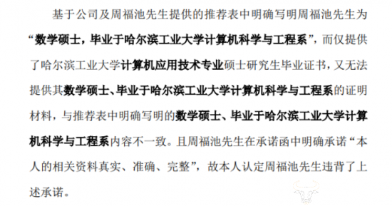 在朗科科技对深交所关注函回复的公告中,董事邓国顺、王荣、钟刚强作出书面回复,表示反对理由为周福池“仅提供了哈尔滨工业大学计算机应用技术专业硕士研究生毕业证书,无法提供其数学硕士、毕业于哈尔滨工业大学计算机科学与工程系的证明材料”,涉嫌学历造假。