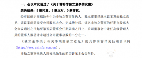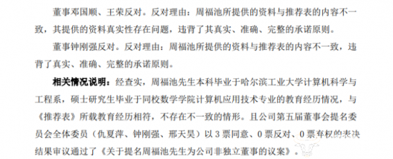 这3位投反对票的董事为邓国顺、王荣和钟刚强,他们所持的反对理由为“周福池所提供的资料与推荐表的内容不一致,违背了其真实、准确、完整的承诺原则。”