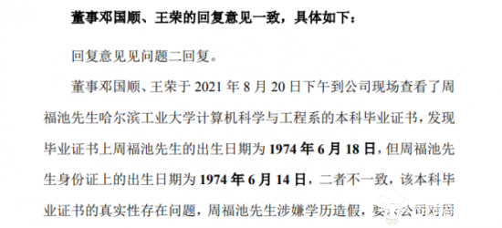 2021年8月20日,邓国顺、王荣到公司现场查看了周福池哈尔滨工业大学计算机科学与工程系的本科毕业证书,但又提出周福池身份证和毕业证书上的出生日期不一致,毕业证书的真实性存在问题。