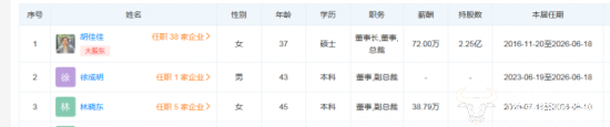 据天眼查信息显示,胡佳佳从公司获得的报酬为72万元,同时持有公司股份2.25亿。