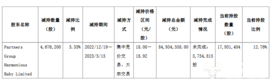 6月6日,公司发布公告称,股东合众投资(Partners Group Harmonious Baby Limited)在2022年12月19日至2023年5月15日减持公司股票467.62万元,套现总额约8493.46万元。