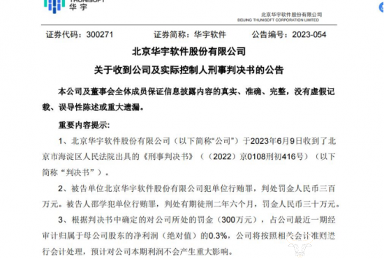 该事件一直到直到今年6月12日,有了最终结果,华宇软件披露关于收到公司及实际控制人刑事判决书的公告,北京华宇软件股份有限公司于2023年6月9日收到了北京市海淀区人民法院出具的《刑事判决书》((2022)京0108刑初416号)。被告单位北京华宇软件股份有限公司犯单位行贿罪,判处罚金人民币三百万元。被告人邵学犯单位行贿罪,判处有期徒刑二年六个月,罚金人民币三十万元。