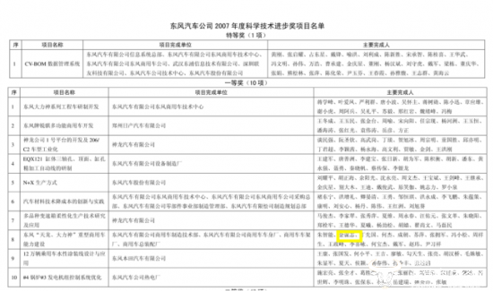 不过,东风汽车公司曾披露过一份2007年度科学技术进步奖项目名单,金谋志曾作为东风“天龙、大力神”重型商用车能力建设项目板块的主要完成人出现。据悉,该项目获得了一等奖,获奖项目完成单位为东风汽车有限公司商用车制造技术部,东风汽车有限公司商用车车身厂、商用车车架厂、商用车总装配厂。