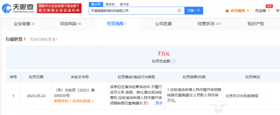 值得注意的是,天眼查信息显示,2023年5月22日,天津猫眼现场科技有限公司收到(京)文执罚〔2023〕第200035号罚单。该公司因在演出经营活动中,不履行应尽义务,倒卖、转让演出活动经营权,被北京市文化和旅游局罚款7万元,并且没收违法所得约1788元。