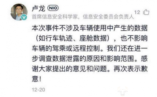 卢龙也在蔚来官方社区回应表示:本次事件不涉及车辆使用中产生的数据(如行车轨迹、座舱数据),也不影响车辆的驾乘或远程控制。我们还在进一步调查数据泄露的原因和影响范围。感谢大家提出的意见和问题。再次表示歉意。