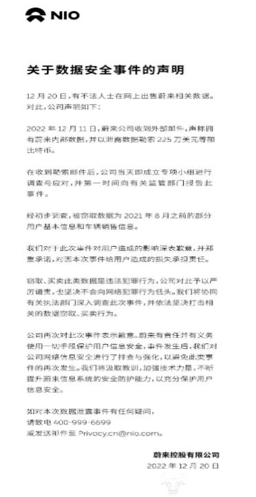 对此,蔚来官方发布声明:在收到勒索邮件后,公司当天即成立专项小组进行调查与应对,并在第一时间向有关监管部门报告此事件。还表示:对于此次事件对用户造成的影响深表歉意,郑重承诺对因本次事件给用户造成的损失承担责任。