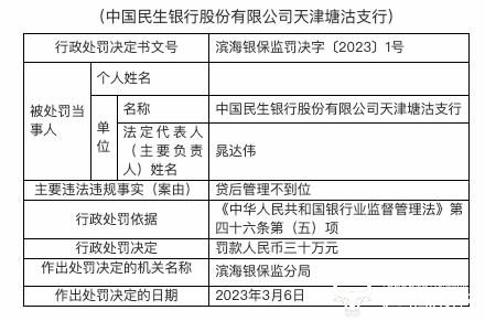 今年3月1,天津滨海银保监分局的一则行政处罚信息公开表显示,民生银行天津塘沽支行因贷后管理不到位,被处罚款人民币三十万元。这也是提醒鞠伟宇需要加强对旗下支行的管理。