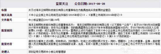 值得一提的是,2017年8月,中小板公司管理部公布了对海洋王照明董事杨志杰配偶违规买卖股票的监管函。