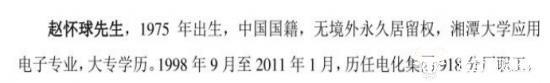据公司招股书显示,赵怀球出生于1975年,按时间推算,今年48岁。大专学历,曾就读过湘潭大学应用电子专业。