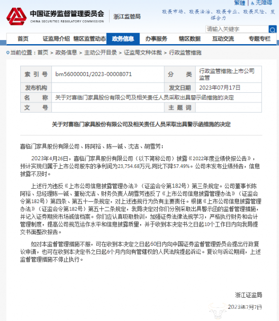 值得一提的是,2023年7月7日,喜临门发布公告称,公司近日收到了中国证券监督管理委员会浙江监管局下发的《关于对喜临门家具股份有限公司及相关责任人采取出具警示函措施的决定》。警示函下发的对象是喜临门公司、董事长陈阿裕、总经理陈一铖、董秘沈洁、财务负责人胡雪芳。原因是公司未发布业绩预告,信息披露不及时。