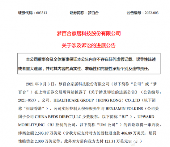 梦百合曾遭受重挫。公告显示,2022年2月8日,美国一家法院出具调整后的判决书,梦百合董事长倪张根和公司需向其美国经销商BJ支付1850.72万美元(含梦百合方应支付对方的股权退出款406.89万美元、惩罚性赔偿金1151.61万美元等。此外对方需向梦百合方支付123.31万美元货款。