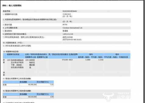 值得一提的是,香 港交易所于8月21日披露文件,内容显示佐丹奴大股东DAVID MICHAEL WEBB在8月15日以每股均价3.216港元售出公司97.8万普通股股份,价值约314.52万港元。