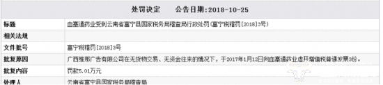 值得一提的是,昆药集团旗下子公司血塞通药业曾于2018年10月被云南省富宁县国家税务局稽查局罚款5.01万元。