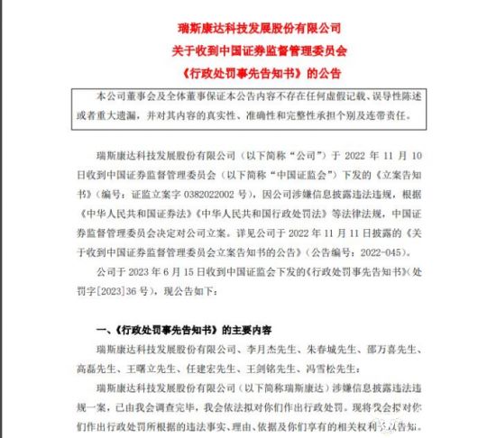 回顾瑞斯康达收《行政处罚事先告知书》事件,据公司2023年6月17日公告称,公司于2023年6月15日收到中国证监会下发的《行政处罚事先告知书》(处罚字[2023]36号)。