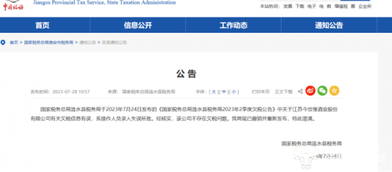 事实上,有关今世缘欠税的报道传闻是场乌龙。此前,税务机关在欠税公告中关于公司的欠税信息有误,而后媒体对此进行了报道,在7月28日,税务机关已撤销并重新发布,还另发了澄清公告,以证明公司不存在欠税情形。