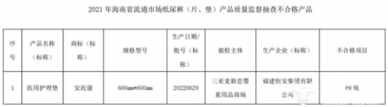 值得一提的是,2022年1月,海南省市场监督管理公布了2021年海南省流通市场纸尿裤(片、垫)产品质量监督抽查结果。本次抽查了35批次产品,经检验,不合格1批次,为恒安国际旗下子公司福建恒安集团有限公司生产(标称)的1批次“安而康”医用护理垫。