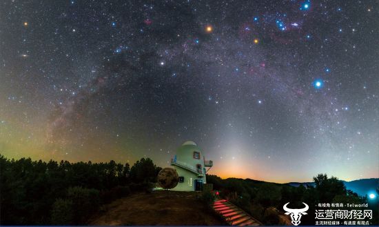 顶层是一个可以360度旋转、5米直径的天文观测圆顶,内置一台大口径专业级天文望远镜,晴朗无云的夜晚,可以观测行星、恒星和星云。