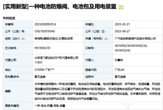 值得注意的是,王清泉在今年申请了一个新专利,名字为《一种电池防爆阀、电池包及用电装置》。而日前广汽埃安刚举行弹匣电池2.0枪击试验发布会。这意味着王清泉在弹匣电池2.0枪击试验中很可能提供了技术支持。