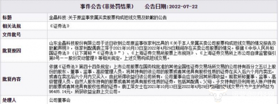 随后,金晶科技在2022年9月2日公告,上海证券交易所上市公司管理一部对张家利予以监管警示,文件批号为上证公监函[2022]0120号。不久山东证监局后也发布了张家利给予警告,并处以10万元罚款的处罚公告。