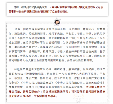近期,医药反腐风暴席卷整个行业。日前,知名药企片仔癀旗下子公司福建化妆品有限公司原董事长林进生因严重违纪违法被立案审查调查后“双开”,引发行业震动。但据悉,这不是片仔癀旗下企业第一位被查的高管了,直至目前,片仔癀及旗下企业已有不少高管先后接连被查!