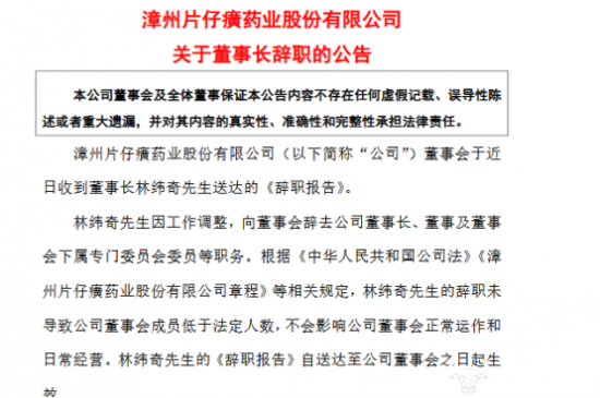 但就在前不久,片仔癀于7月25日发布公告称,林纬奇辞职,但对于其辞职原因,公告中并未说明。目前,公司董事长由林志辉接任。