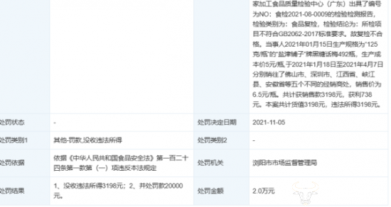 值得注意的是,盐津铺子在2021年曾受到浏阳市市场监督管理局的行政处罚。原因是公司生产的黑糖话梅被检出铅(以Pb计)含量检测值不合格。盐津铺子对此申请复检,但复检结果仍为不合格。对此,监管局对公司没收违法所得3198元,并处以罚款2万元。