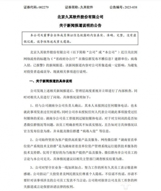但是在7月16日,久其软件对此发布了澄清公告称,公司没有工作人员提及过“病毒入侵”的信息,网传微信群内非公司员工的言论与该公司无关。