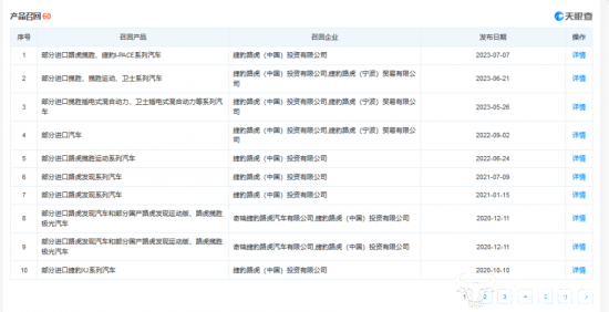 据了解,召回原因是部分车辆的尾灯线束可能受到挤压而损坏,导致尾灯无法正常工作,增加发生碰撞的风险,存在安全隐患。天眼查APP显示,这已经是捷豹路虎今年第三次召回产品。