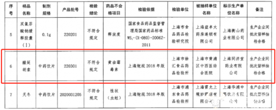 据8月28日上海药监局发布的抽检通告,上海市药监局组织相关单位对本市药品生产、经营和使用单位开展了药品质量抽检。其中标示生产单位由上海同济堂药业有限公司生产的中药饮片醋延胡索不符合规定。涉及生产批号为220301,涉及的药品不合格项目为黄曲霉毒素,但生产企业同批次留样抽检结果为合格。