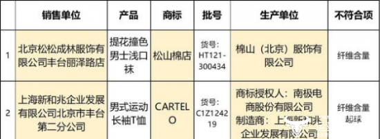 值得注意的是,松山棉店此前也曾抽检不合格。2021年12月31日,北京市丰台区市场监督管理局发布当年第3期产品质量监督抽查信息的公告,内容显示由北京松松成林服饰有限公司丰台丽泽路店销售的、标示生产单位为棉山(北京)服饰有限公司的“松山棉店”提花撞色男士浅口袜经检验不合格。涉及产品批号为“货号:HT121-300434”,不符合项为“纤维含量”。