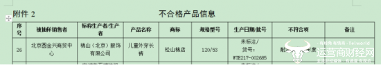 其中,由北京圆金兴商贸中心销售的、标示生产者为棉山(北京)服饰有限公司的“松山棉店”儿童外穿长裤不合格。涉及规格型号为“120/53”,涉及生产日期/批号为“未标注/货号:WTE217-002685”,涉及不合格项为“耐湿摩擦色牢度”。