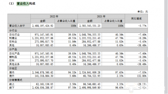 与之不同的则是糖制品、饮料产品。饮料业营收在整体中的占比由11.02%上升至11.06%,制糖业从47.79%上升至49.51亿元。两者在2022年更是给公司贡献了约15.07亿元的营收,远超日化板块。