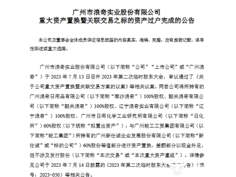 在本次交易中,广州浪奇将公司所持的南沙浪奇、韶关浪奇、辽宁浪奇的100%股权及广州市日用化学工业研究所的60%股权,与广州轻化工工贸集团所持的广州新仕诚企业发展股份有限公司60%股权的等值部分进行了资产置换,差额部分以现金补足。自此,广州浪奇成为新仕诚的控股股东。