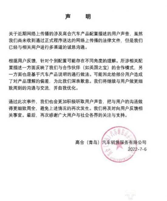 对此,高合汽车回应表示:根据用户反馈,针对个别配置可能存在不同角度的理解。所涉相关配置描述一方面反映了我们对合作伙伴(如英国之宝)的合作模式,另一方面也是基于汽车产品说明的通行做法。可能因此给部分用户造成对产品的理解偏差。