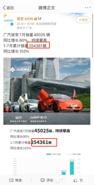 运营商财经网注意到,日前,广汽埃安官方发布数据表示,2023年1月-7月,广汽埃安累计销量为254361辆,同比增加103%。