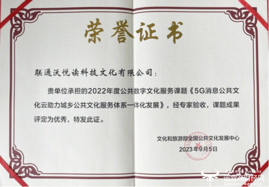 9月4日-5日,由文化和旅游部指导,中国文化馆协会、包头市人民政 府主办的2023年中国文化馆年会在内蒙古包头成功举办。联通在线长沙公司作为文化馆协会会员单位受邀参加,并凭《5G消息公共文化云助力城乡公共文化服务体系一体化发展》项目,荣获文化和旅游部全国公共文化发展中心颁发的优秀课题成果。