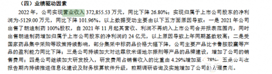 对此,公司还在年报中声明业绩下原因之一为2021年公司出售了朗迪制药100%股权,自2021年11月起其营收、利润不再纳入公司合并报表范围等。