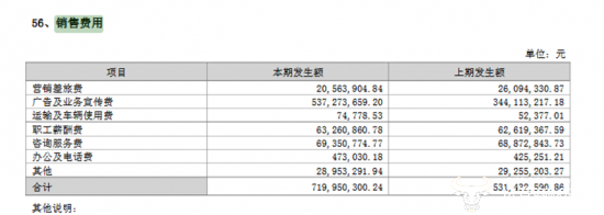 其中,销售费用中广告及业务宣传费最高,约5.37亿元,营销差旅费、咨询服务费则共计高约8991万元。
